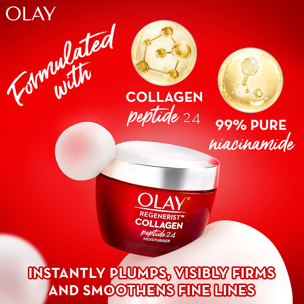 Plump & Bouncy Skin all day long. Olay’s Unique technology Collagen Peptide 24 penetrates^ better into the skin. Regular collagen have larger molecules that couldn’t penetrate into the skin. Olay’s Collagen Peptide is a smaller molecule, hence it penetrates^ better into the skin.