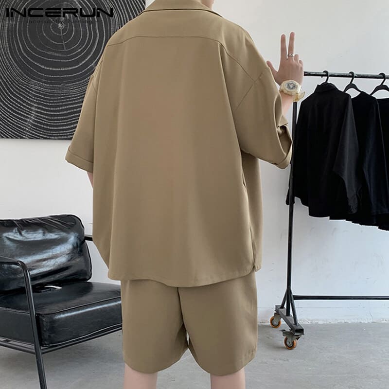 INCERUN Men Short Sleeve Korean Style Casual Suits Button Shirts Elastic Waist Short Sets (Korean Style)