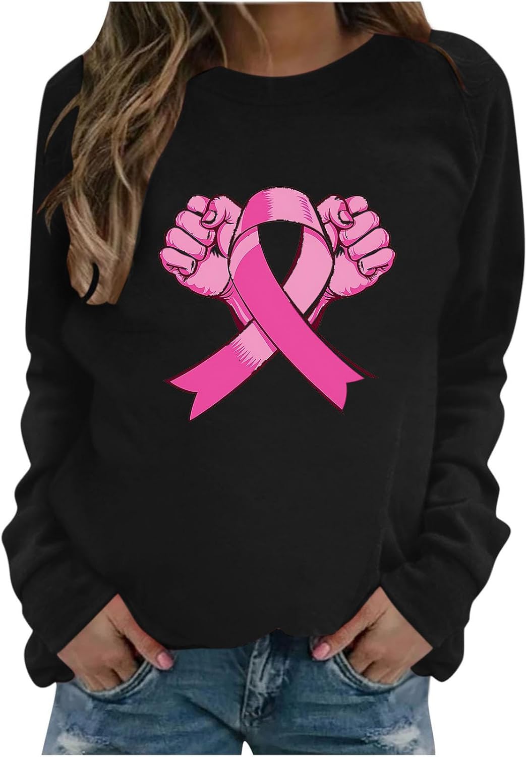 Pink Ribbon Shirts For Women Breast Cancer Awareness Crewneck Sweatshirts Long Sleeve Breast Cancer Survivor Clothes